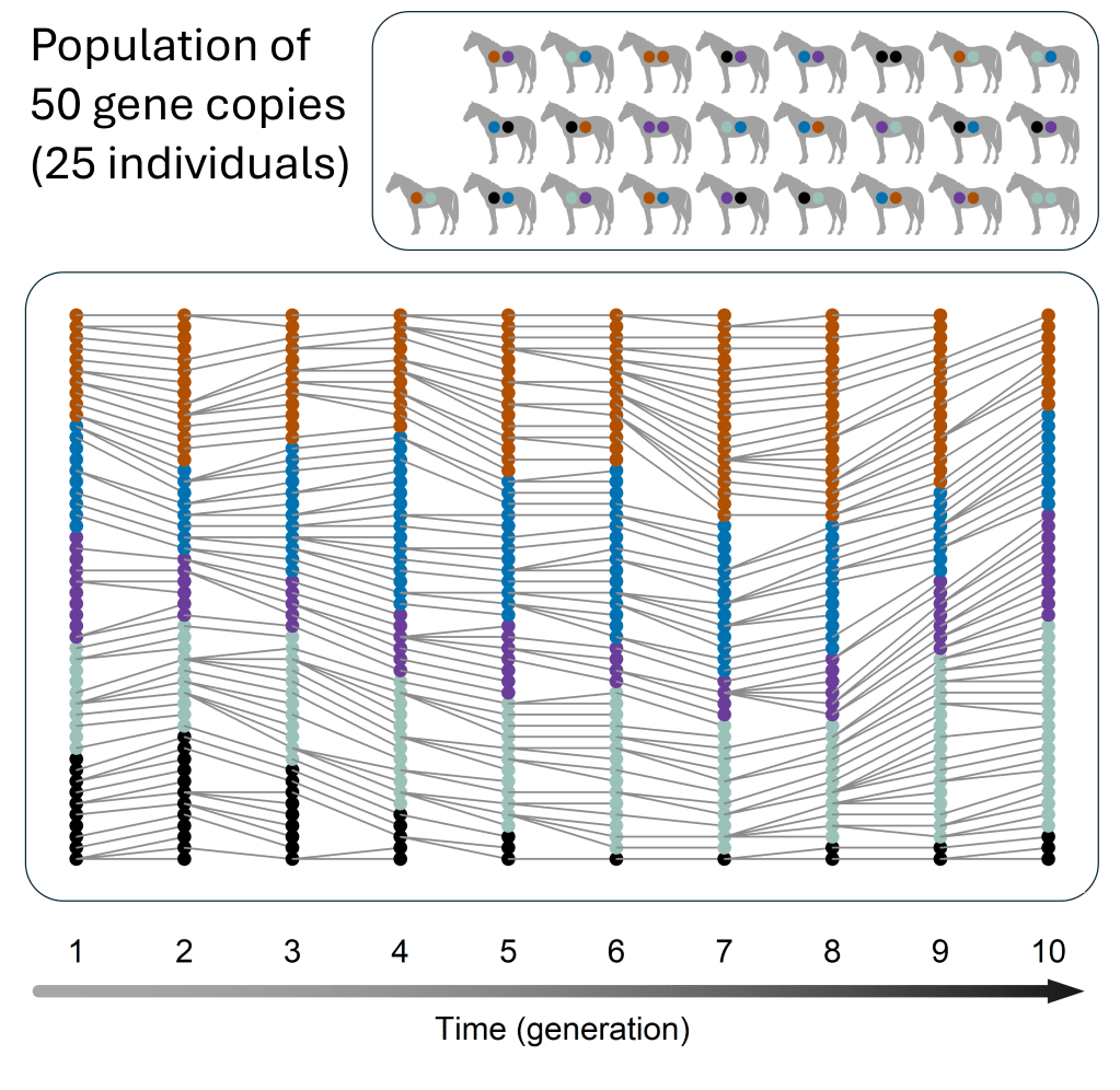 Example of a population of 10 gene copies. Each gene copy is represented by a point, and different colours represent different versions of the gene. The top panel shows that 10 gene copies correspond to 5 individuals (in this example, horses), as each individual carries two gene copies. The bottom panel shows how version frequencies randomly change over time. The versions are sorted by colour for visibility, but they are randomly distributed among individuals in the population. In the first generation (left), all versions have the same frequency (2/10=0.2). Copies reproduce randomly from generation to generation. “Parent copies” are connected to their “offspring copies” in the next generation by lines.