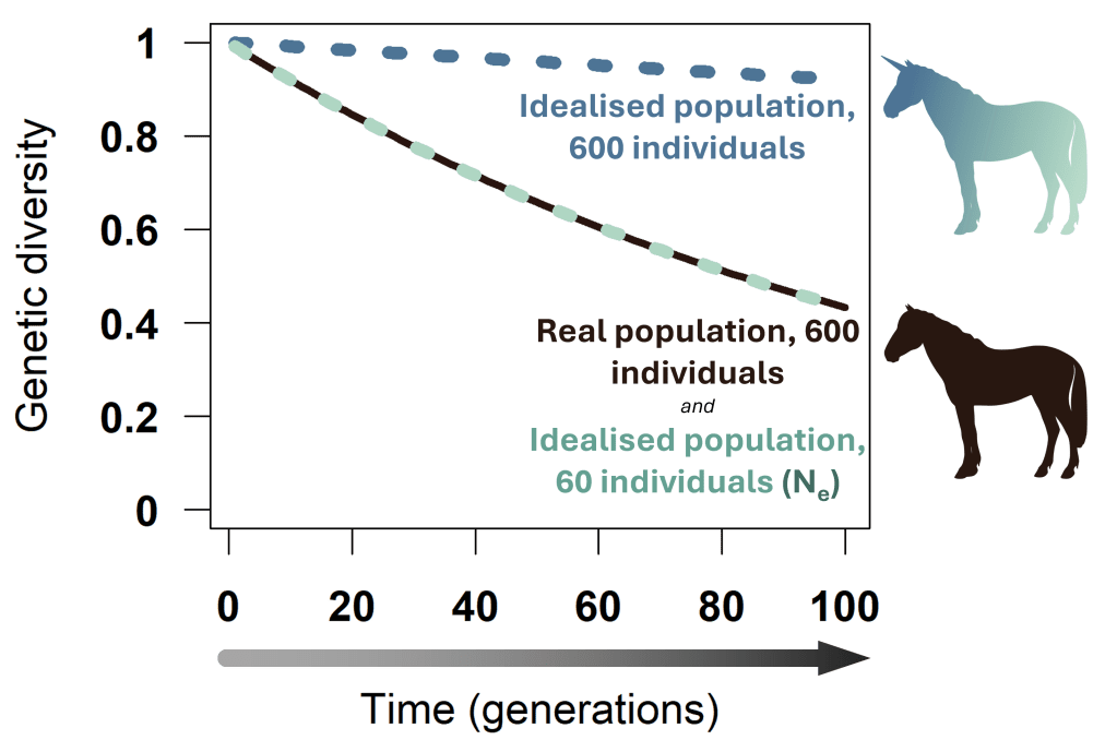 Genetic diversity (heterozygosity) loss over time in an example real population of size 600 individuals (brown) and idealised populations of 600 (blue) and 60 individuals (turquoise). The idealised population is symbolized by a unicorn, as it does not exist (we in GINAMO do not believe in unicorns), while the real population is symbolized by a horse. Studies have shown that Ne is much smaller than the count of mature individuals in both wild and domestic horse populations.