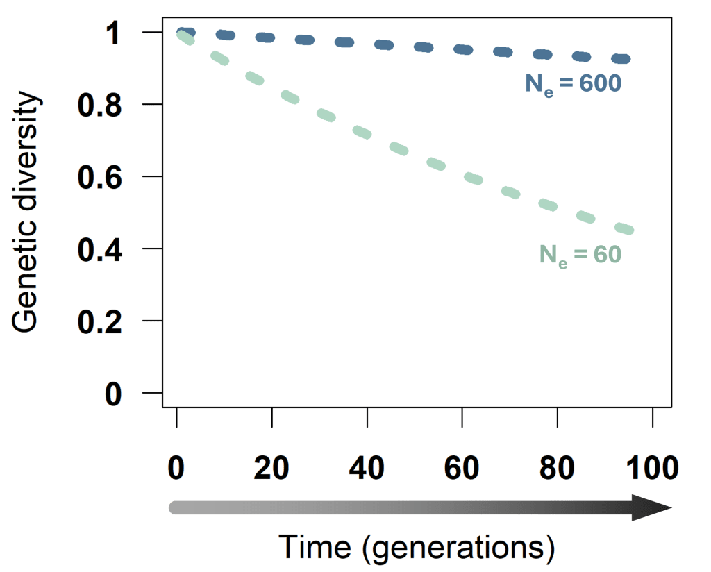 Ne is a measure of population size that doesn’t directly count the number of individuals, but instead reflects how many individuals actually pass on genes to the next generation and how similar their contributions are. The more individuals reproduce and the more similar their offspring numbers are, the larger is Ne. And the larger Ne, the less genetic diversity is lost over time. This plot shows that genetic diversity is lost much faster in a population with Ne 60 than one with Ne 600.